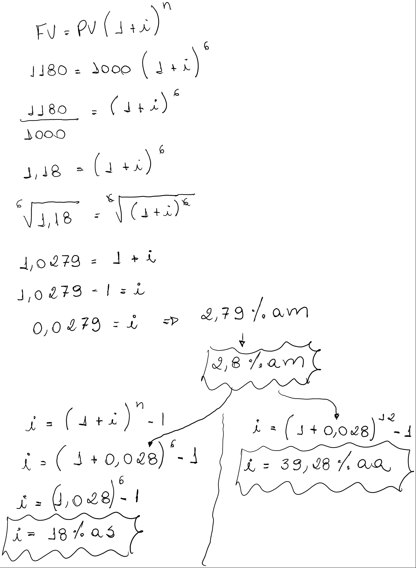 Um banco publica em suas agências o seguinte anúncio: “aplique R$ 1.000,00 hoje e receba R$1.180,00 ao final de 6 mêses”. Determinar a efetiva taxa mensal, semestral e anual de juros oferecida por esta aplicação.